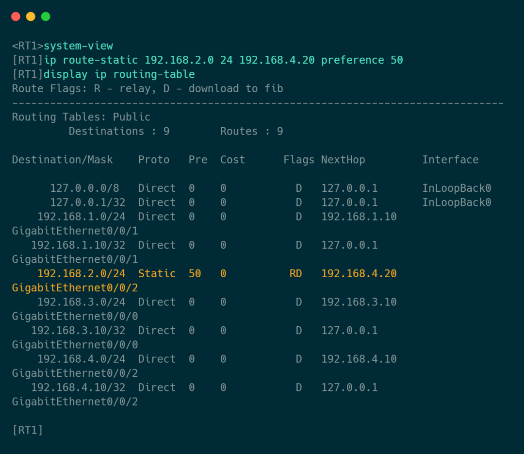 8、浮动静态路由:当一条主用路由发生故障时,自动切换到备用路由。