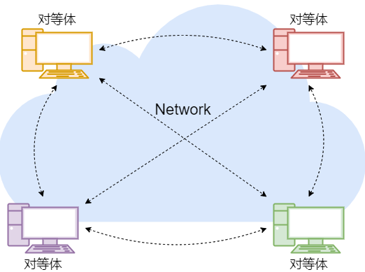 2、P2P 模型:一种应用层协议模型,这种模型的应用协议会在主机之间建立对等体连接,每台主机身份对等,它们可以提供服务,也可以接受服务。
