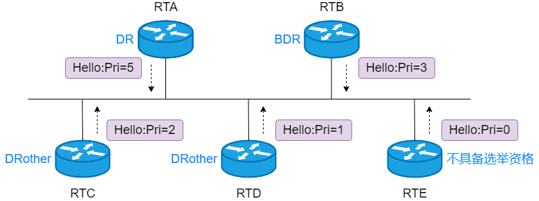 5、DR 和 BDR :指定路由器和备份指定路由器。在多路访问网络中,为减少网络中传输 OSPF 管理流量,而设置的 OSPF 接口角色。