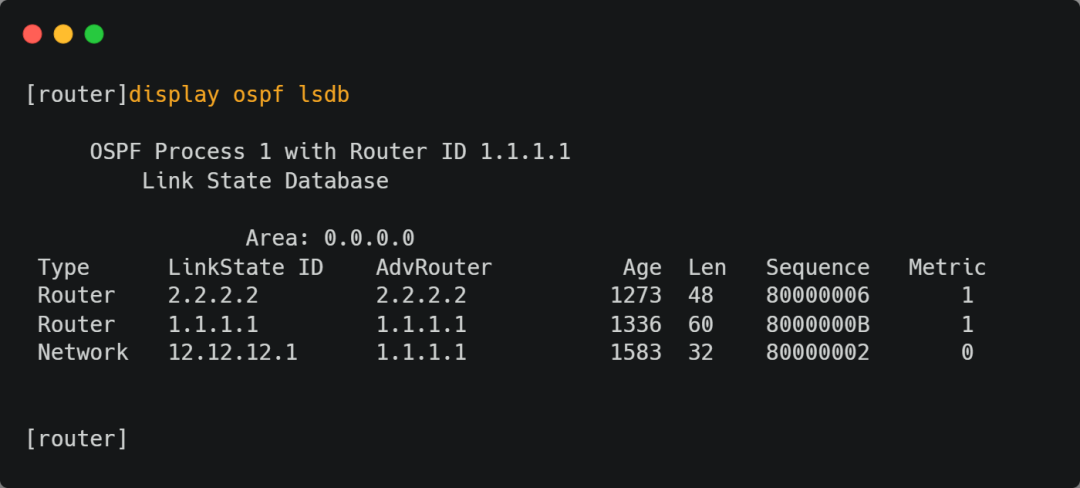2、OSPF 拓扑表:即链路状态数据库,包含了同一区域内所有其它路由器通告的链路状态信息。