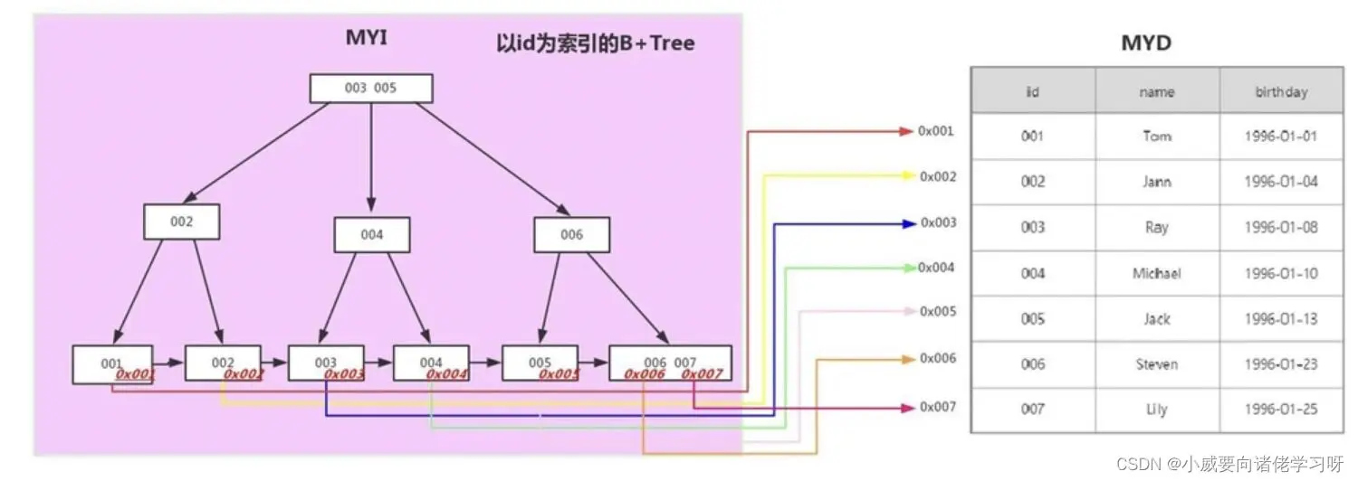 非聚簇索引:数据储存于索引分开,叶节点指向了对应的数据行。辅助索引访问数据时需要二次查找。辅助索引存储的不是行的物理位置,而是主键的值。而通过辅助索引首先找到的就是主键的值,再通过主键的值找到数据行对应的数据页,最后才能找到对应行。