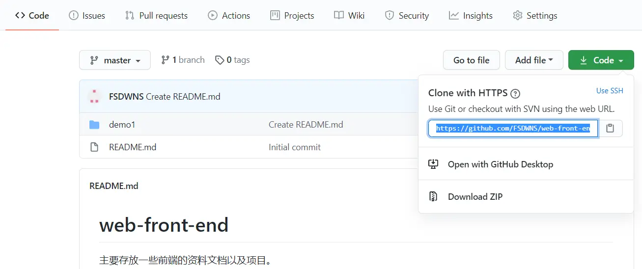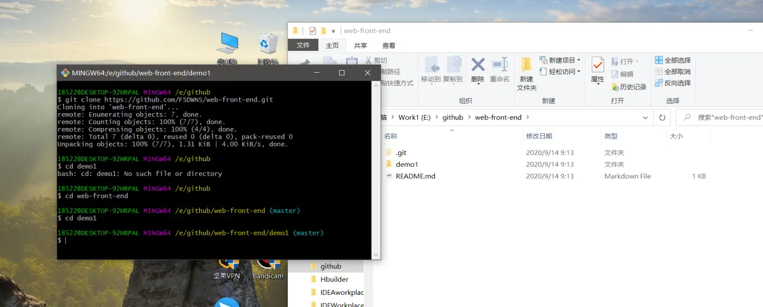 由于我在github上面新建了一个文件夹demo1。此时我要上传文件夹,我需要切换到demo1文件夹下。这个无所谓,如果你没有新建,直接上传文件夹也行,这一步就略过。