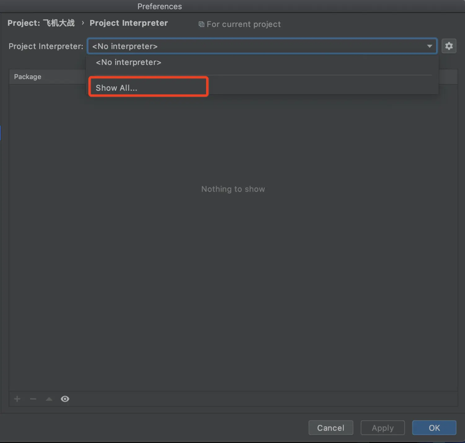 image.png点上图蓝色部分的文字 Configure Python interpreter,会打开IDE 的偏好设置,我们选 Show All…,如下图:
