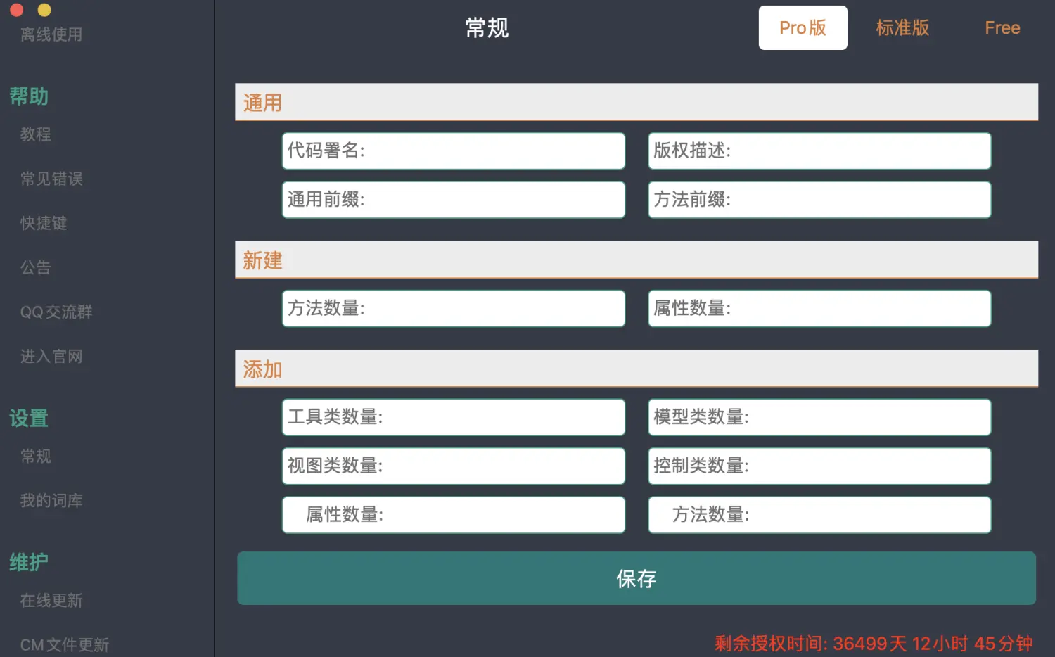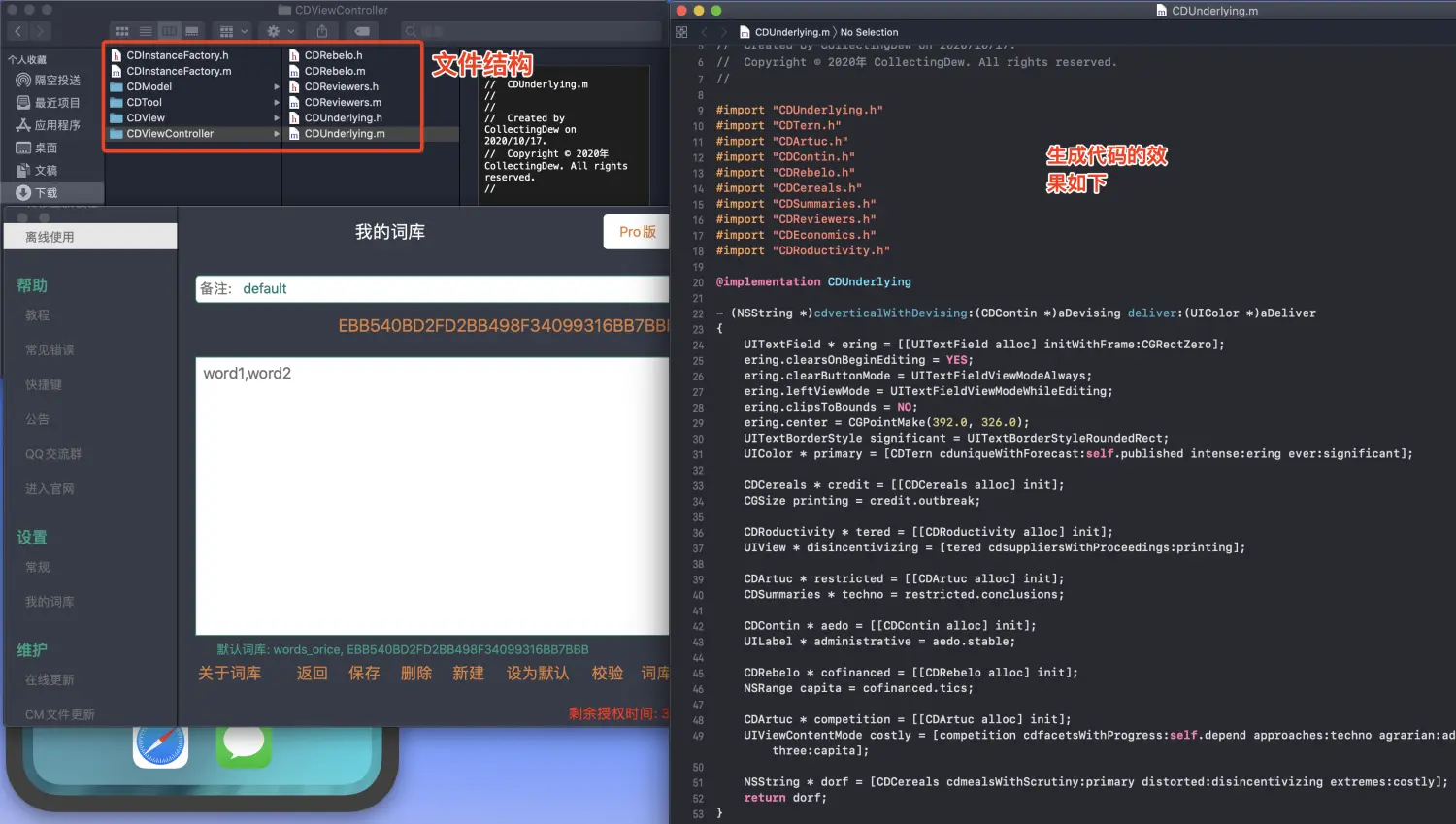 功能支持:利用自定义单词库生成OC代码、支持自定义单词库、自定义类名、方法名前缀,支持自定义类方法、属性数量,如下图: