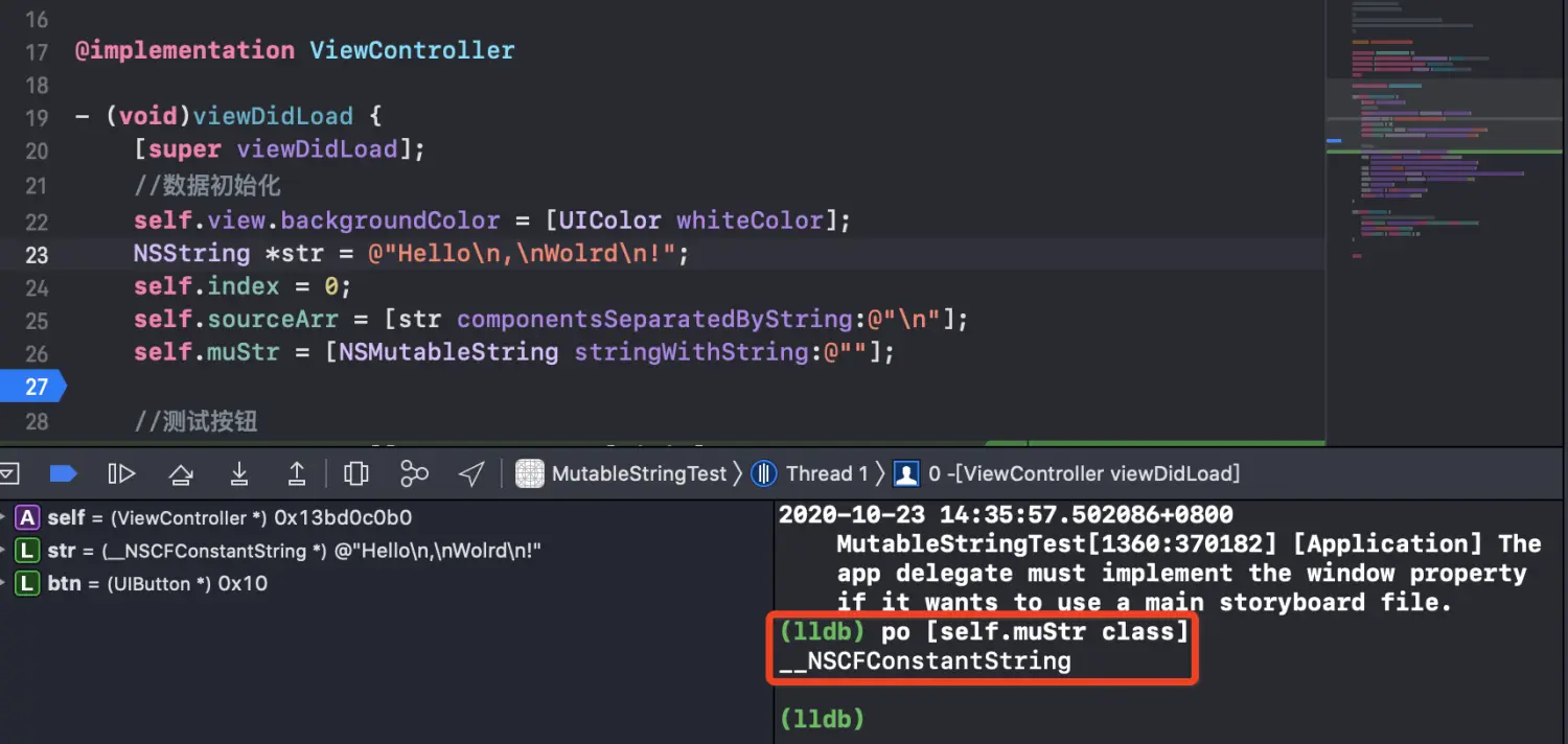 咋看起来, muStr 明明声明的是全局的可变字符串类型,但是当调用appendString:这个方法时却报了上面那个错。在控制台把类型打印出来却发现,self.muStr 居然是不可变的,如下图所示: