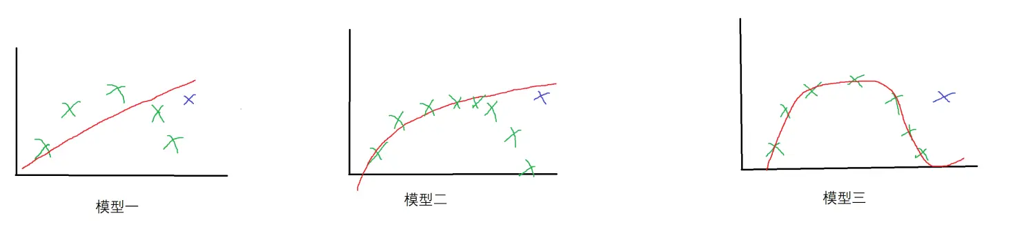 举例:比如下图三个模型,绿色表示训练集样本,红线表示模型的预测能力,蓝色表示新样本点。看模型三在训练集表示很好,但是在新样本表现一般,所以说泛化能力较差,出现过拟合。模型一在训练集表现的也不好,新样本预测也不好,称之为欠拟合。最终我们选择模型二,泛化能力越好,就是越好的模型。 哪个模型的泛化能力较差? 哪个模型的泛化能力较差?